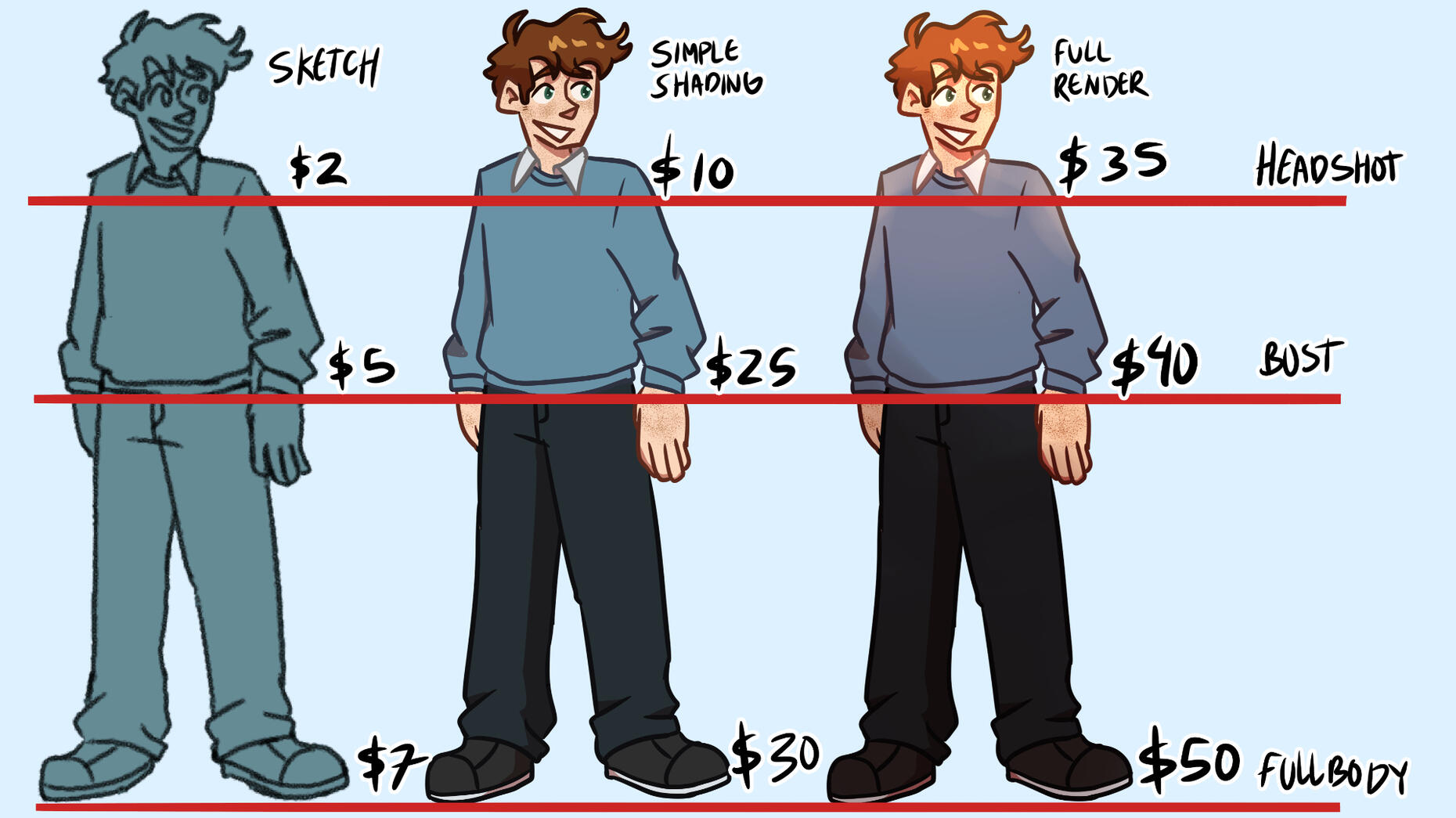 After discussing what the piece will look like, 50% of the price will be paid before I start sketching and the rest will be paid once I finished.